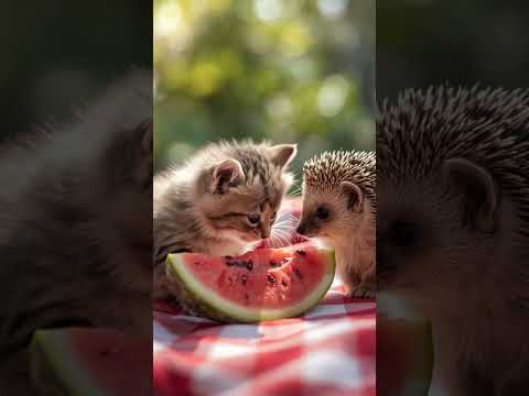 Summer Picnic Buddies 🍉🐱🦔✨ #ねこ #ハリネズミ #夏気分 #kittenandhedgehog #cutepets #summerfeels #adorablemomentって動画が話題らしいぞ